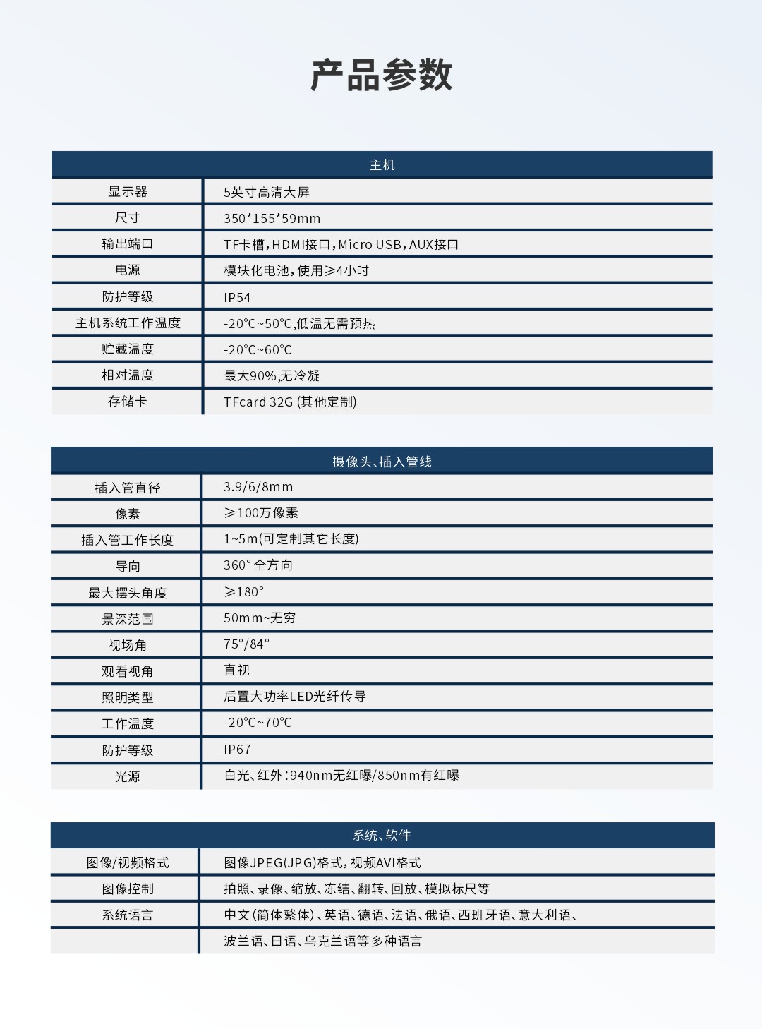 優(yōu)勢特點(diǎn):紅白雙光源一鍵切換;攝像頭拾音、錄音功能;探頭360°轉(zhuǎn)向;可更換不同類型管線;